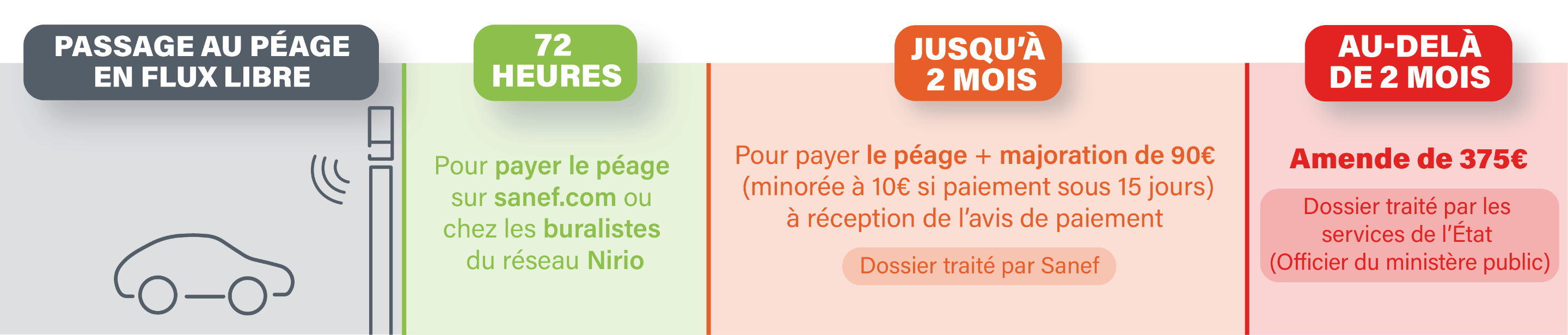 Avec le péage en flux libre, les conducteurs n’ont plus besoin de s’arrêter pour payer le péage. Le paiement s’effectue une fois l’ensemble du trajet terminé, dans un délai de 72h. Les barrières physiques de péage sont remplacées par des portiques équipés de capteurs et de caméras pour calculer et automatiser le règlement des trajets des clients.