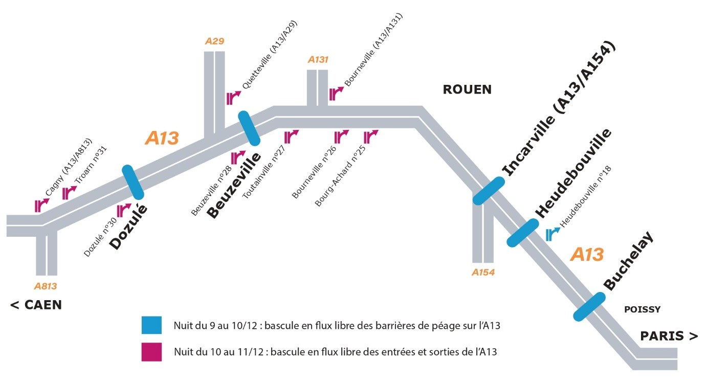 Ainsi, dès le 10 décembre matin, 80% des trajets de l’axe Paris-Normandie seront réalisés en flux libre sur l’ensemble des barrières de péage situées sur l’A13 entre Orgeval et Caen !