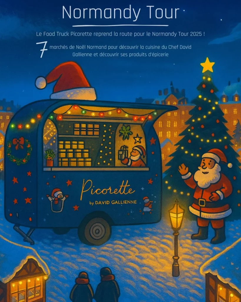 Le chef étoilé et gagnant de Top Chef 𝗗𝗮𝘃𝗶𝗱 𝗚𝗮𝗹𝗹𝗶𝗲𝗻𝗻𝗲 sera présent avec son point de restauration ambulant « Picorette » sur le marché hebdomadaire de Pont-l’Évêque le lundi 22 décembre.