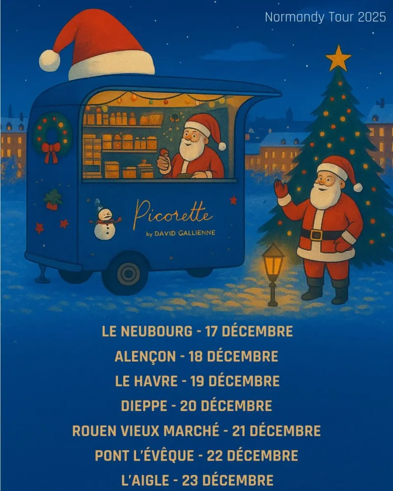 Le chef étoilé et gagnant de Top Chef 𝗗𝗮𝘃𝗶𝗱 𝗚𝗮𝗹𝗹𝗶𝗲𝗻𝗻𝗲 sera présent avec son point de restauration ambulant « Picorette » sur le marché hebdomadaire de Pont-l’Évêque le lundi 22 décembre.