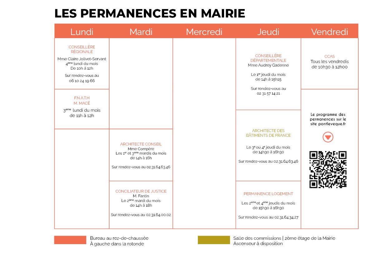 Des permanences accessibles à tous La ville de Pont-l’Évêque accueille et met en place de nombreuses permanences pour que chaque habitant puisse trouver aide et conseils auprès de professionnels.
