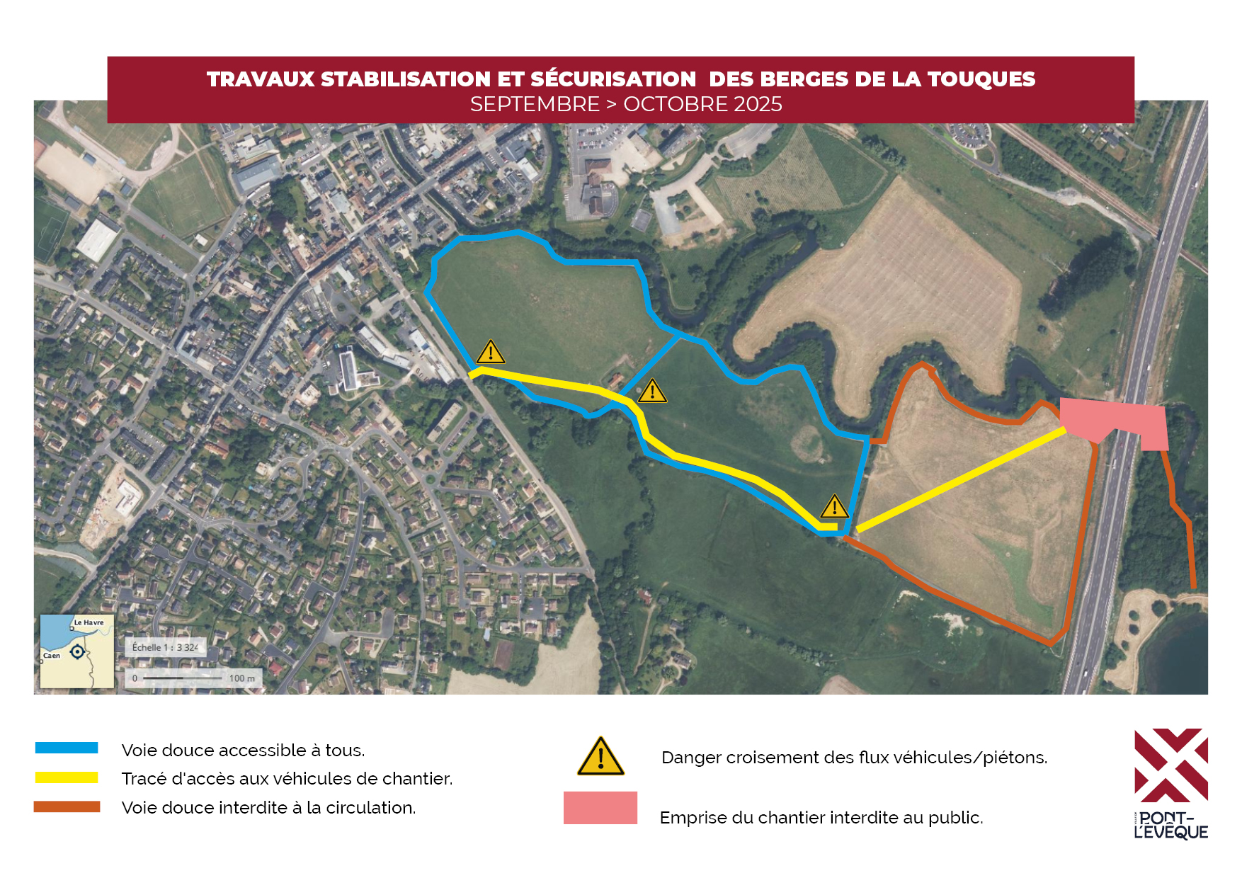 Pour votre sécurité : réalisation des travaux de stabilisation et sécurisation des berges de la Touques afin de rétablir durablement la largeur de passage aux abords du franchissent du pont de l’autoroute A13.