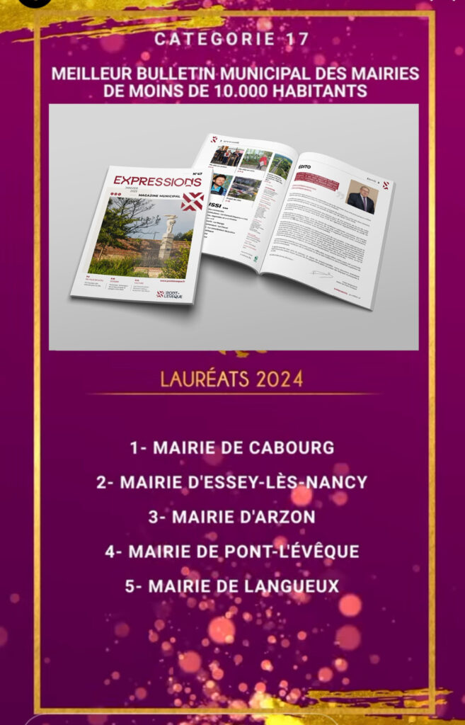 La ville de Pont-l’Évêque est heureuse et fière de vous annoncer qu’elle est Lauréate des Trophées de la communication 2024, à la quatrième place, dans la catégorie Meilleur bulletin municipal des mairies de moins de 10 000 habitants au niveau national !